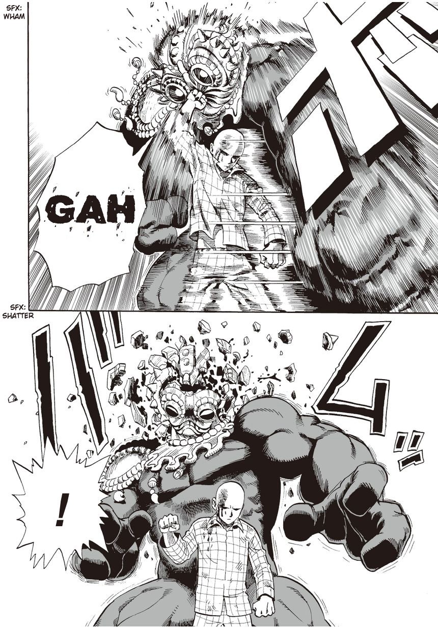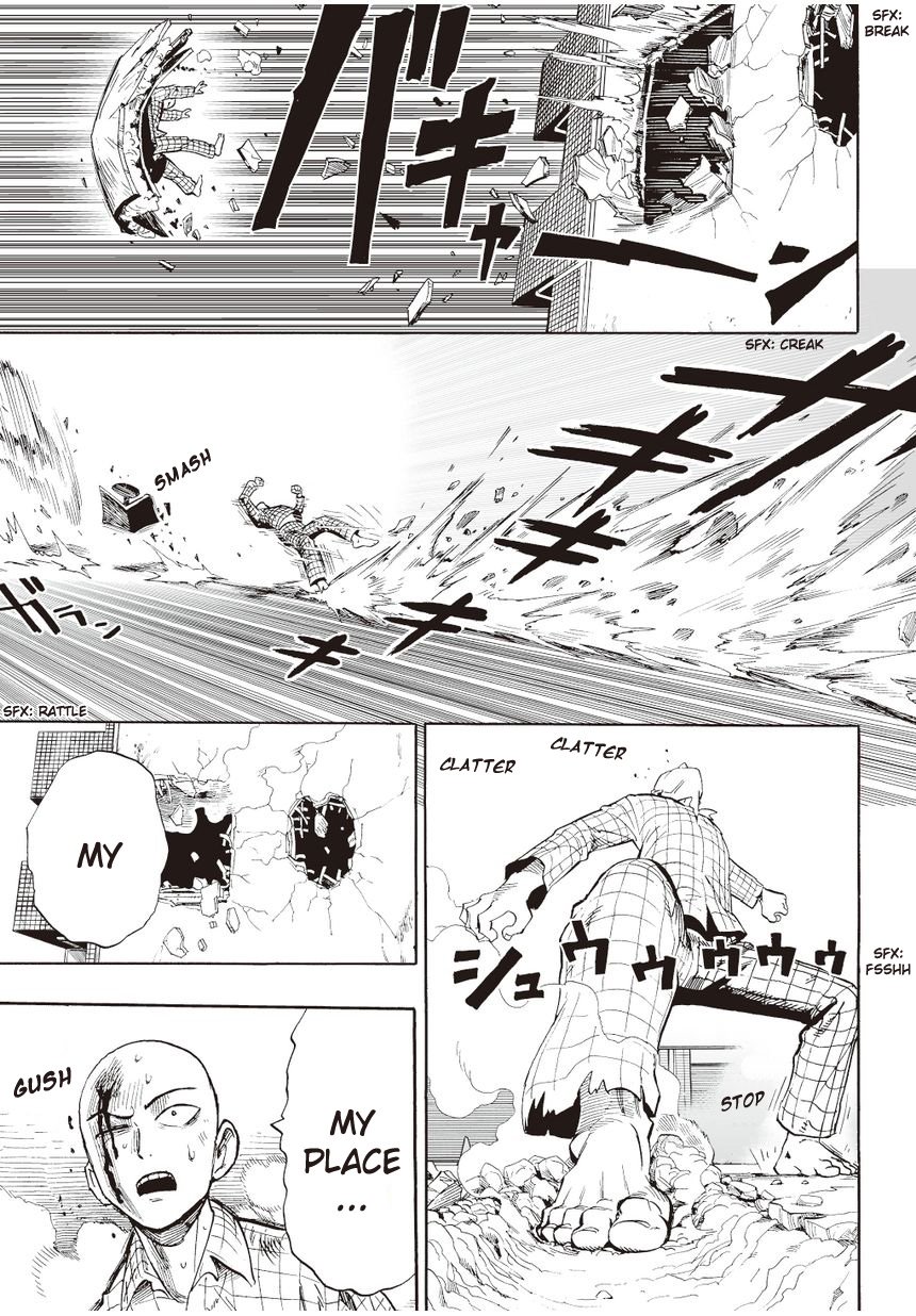 The chapter begins with Saitama peacefully sleeping in his small apartment, only to be violently awakened when his wall explodes and a monstrous hand grabs his head. Instinctively, Saitama counters with a powerful punch, forcing the attacker to let go. But before he can react further, he is hit hard in the face, launching him through a wall and down to the streets below. Despite his incredible strength, this impact leaves his forehead bleeding, signaling a dangerous battle ahead.