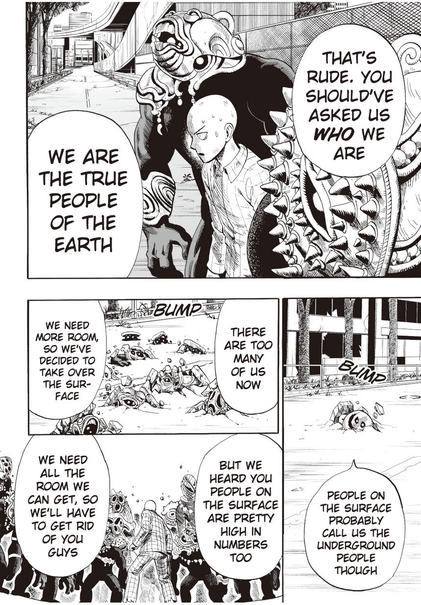 As soon as Saitama regains his footing, more enemies emerge from the ground. These beings reveal themselves as the Subterranean People, declaring their plan to conquer the surface world. Surrounded from all sides, Saitama is forced into an all-out brawl. He fights fiercely, taking down one opponent after another, but the relentless swarm keeps coming.