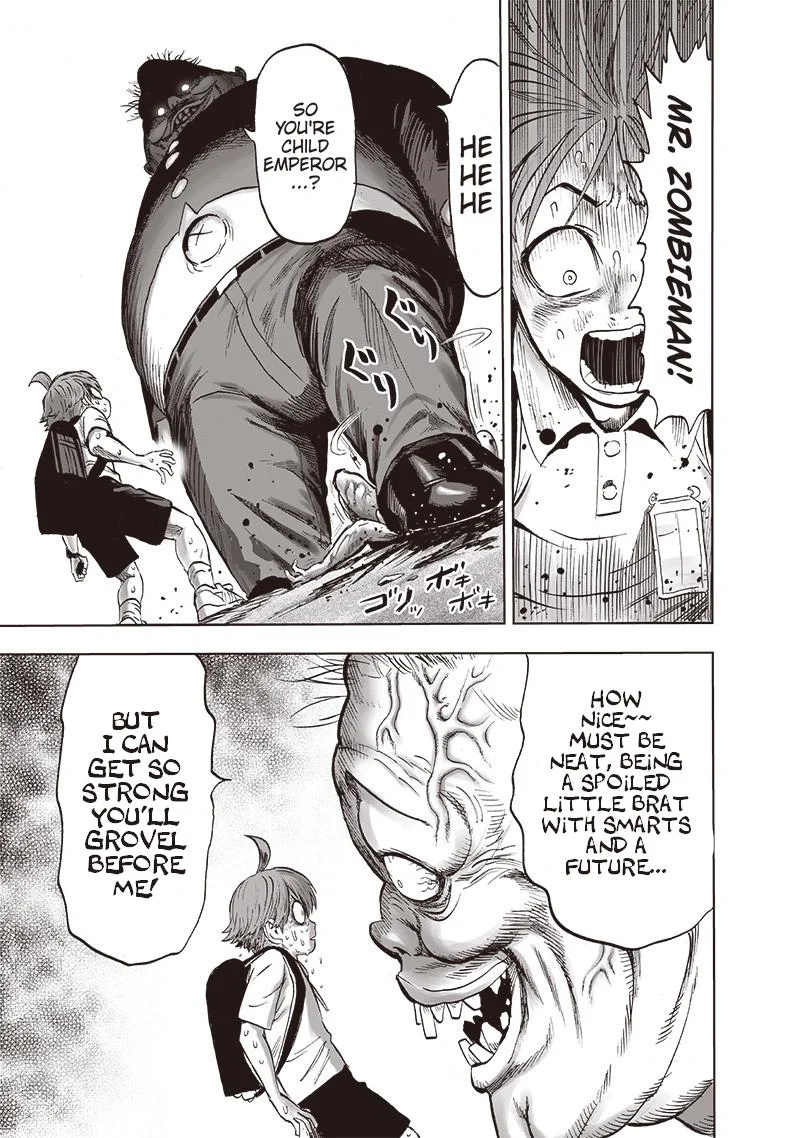 The chapter opens with Darkshine sitting on the ground, a rare sight for the usually confident hero. His expression is heavy with sorrow as fellow heroes Puri-Puri Prisoner and Zombieman approach. They are stunned to discover that Darkshine has been defeated by Garou, a formidable antagonist who continues to push the boundaries of strength and strategy in the One Punch Man manga universe.