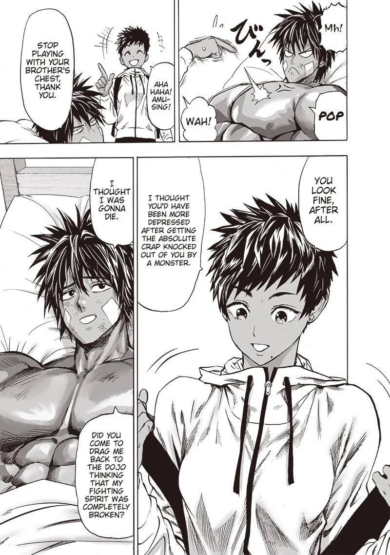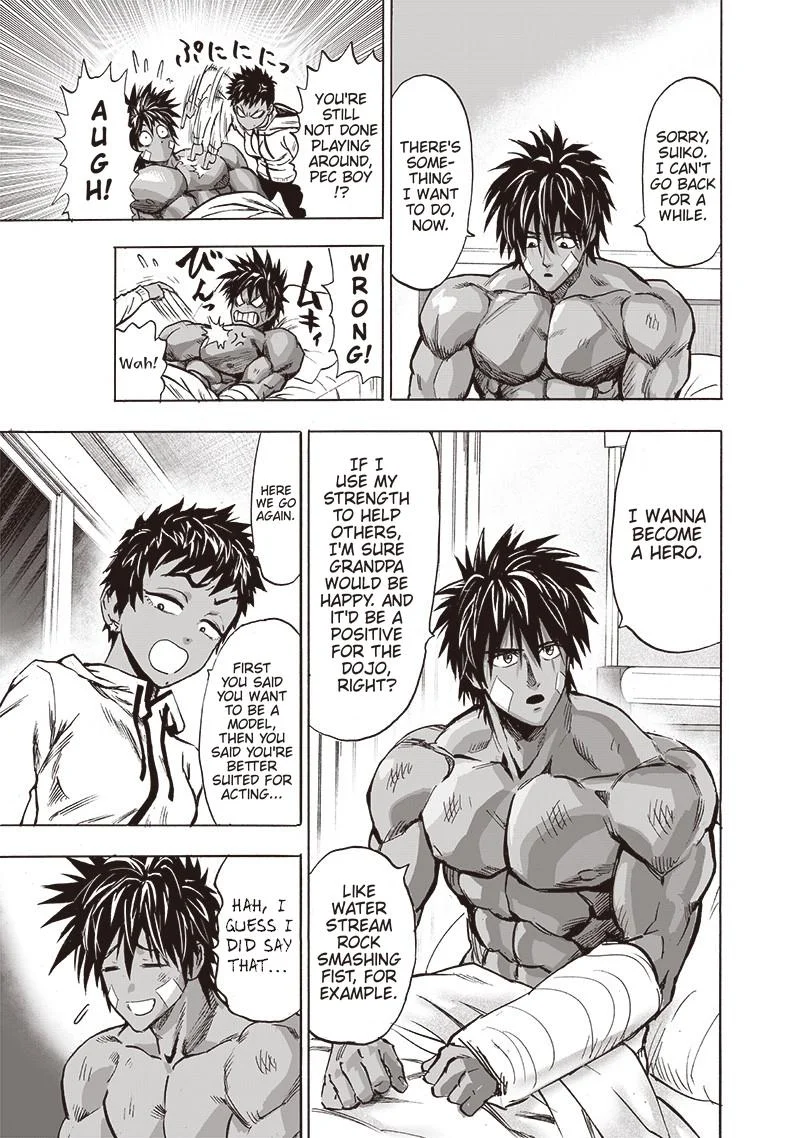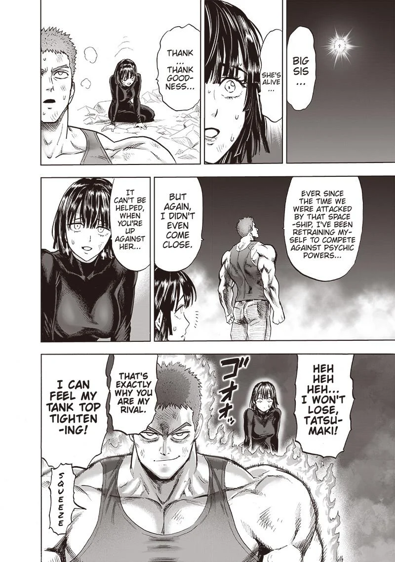 The chapter concludes with the heroes regrouping and planning their next move. Atomic Samurai suggests that they combine their strengths to take on the Monster Association’s leader, emphasizing teamwork and strategy. Shortly after, Tanktop Master arrives, bolstering the team’s morale. Together, they begin plotting a coordinated effort to face the growing threat, setting the stage for intense battles in upcoming chapters.