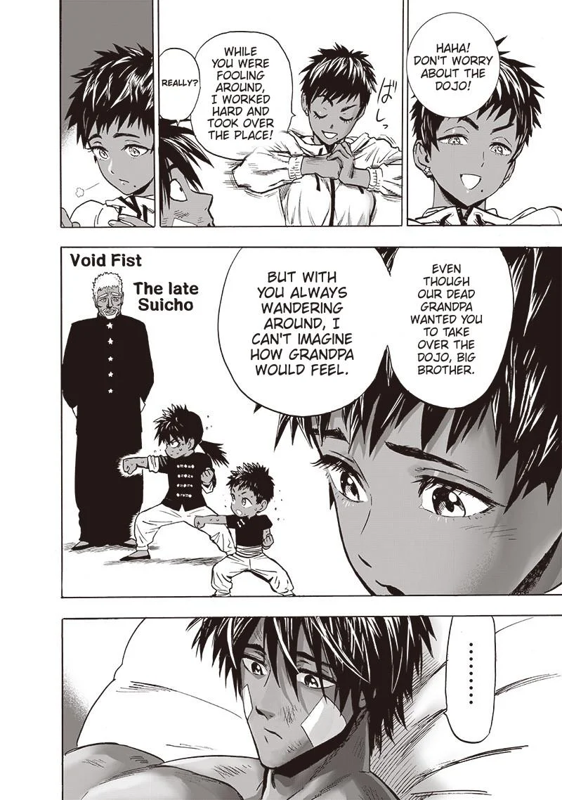 Deep beneath the surface, Garou emerges from a mass of concrete, physically and mentally recovering from his previous encounters. The chapter provides readers with a fascinating glimpse into Garou’s mindset. He ponders why each defeat seems to make him stronger and realizes he is inching closer to embodying the monster he aspires to become.